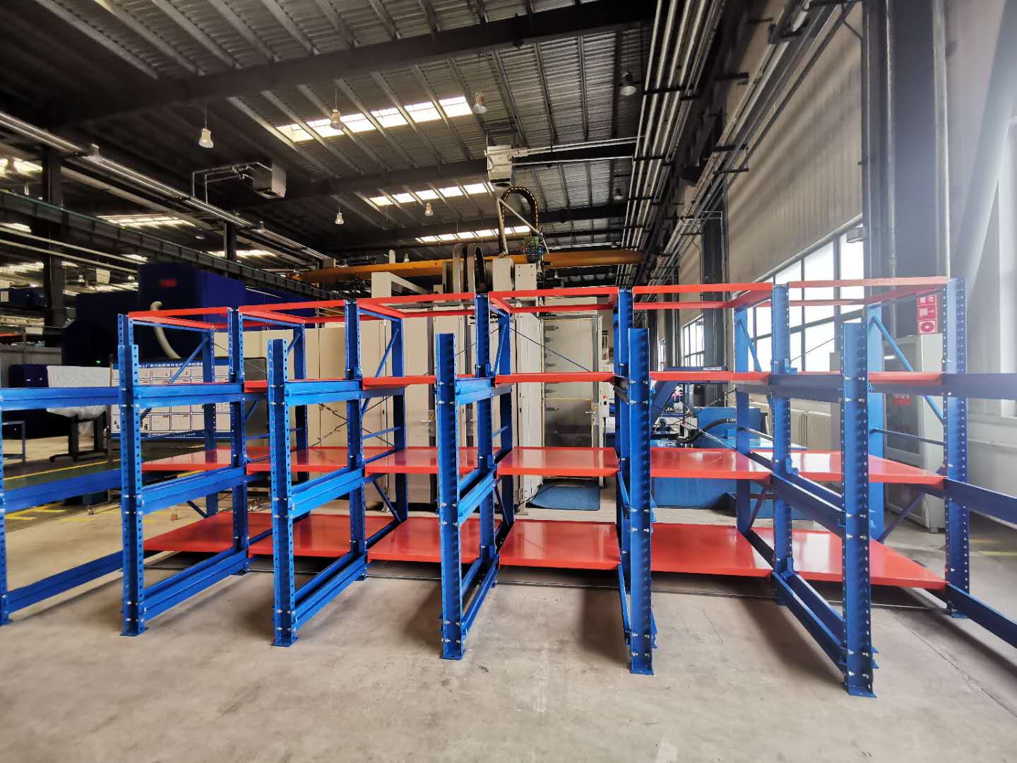 上圖是我司給沈陽一家公司生產(chǎn)定制模具貨架,模具架規(guī)格:L5700*D2600*H2090 數(shù)量一排、層數(shù)為3層加固定板 每層載重1000KG,可抽屜1300MM,立柱10#槽鋼,滑槽4.0+3.0厚度,面板1.5mm 抽屜板可按50倍數(shù)調(diào)節(jié)層高 顏色:立柱藍(lán)色/抽板桔紅色 噴涂 酸洗 磷化 防靜電噴涂