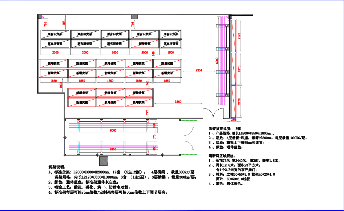 懸臂貨架說明:規(guī)格L4800*W850*H1800 層數(shù) 4層懸臂+底坐,懸臂長(zhǎng)500. 每層承重1000KG/層,層間距:橫梁上下每75mm可調(diào)節(jié) 顏色:通體藍(lán)色